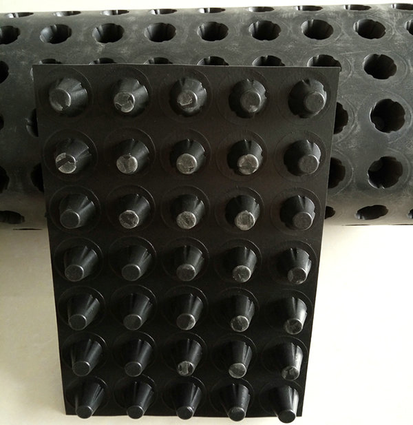 圓錐突臺(tái)(或中空圓柱形多孔)的塑膠底板,由高抗沖聚苯乙烯(HIPS)制成。圓錐突臺(tái)(或中空圓柱多孔)的頂面膠接一濾層土工布,以阻止泥土微粒通過,從而避免通道阻塞,使孔道排水順暢。